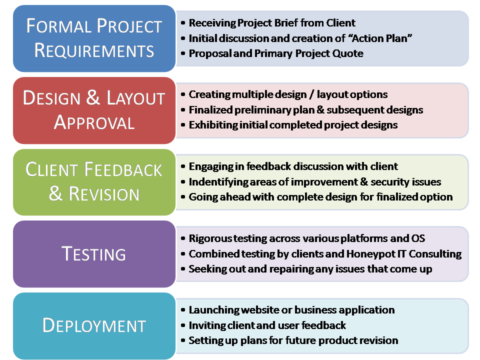 The services and solutions that Honeypot IT Consulting provides come after an adequate amount of planning and development, being followed up by a solid foundation of testing and analysis, with a view towards total quality and value enhancement. Listed below are the different aspects of our methodology that go together to create some of the most lasting business solutions that we have been known to provide.